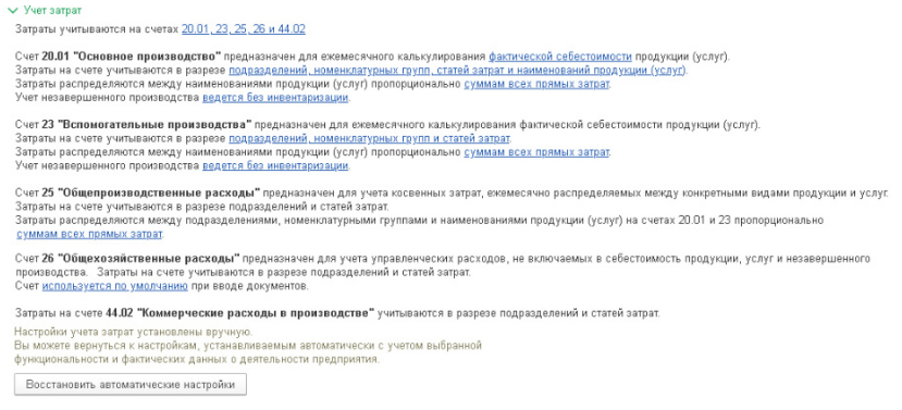 Начинаем с учета затрат. Определяем счета, которые у нас будут использоваться. Как мы с Вами заметим для каждого счета есть небольшое пояснение которое описывает порядок учета затрат – это поможет нам структурно ввести настройки.