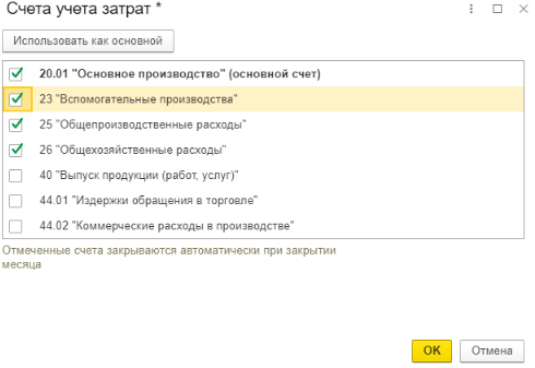Например, для того чтобы настроить счета учета затрат, необходимо перейти по ссылке, расположенной рядом с текстом «Затраты учитываются на счетах» и в открывшейся форме Счета учета затрат нужно отметить флагами те счета, которые будут использоваться для отражения затрат и которые должны закрываться автоматически.