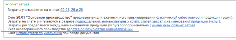 Ведется без инвентаризации. В случае этой настройки НЗП формируется автоматически. Прямые затраты на счете 20 могут отражаться по субконто «Номенклатурная группа» или «Продукция» .Т. е если есть выпуск продукции или выручка по работам (услугам) – закрывается с образование регламентной операции , а если не было выпуска продукции, реализации работ (услуг), то остается в виде НЗП.