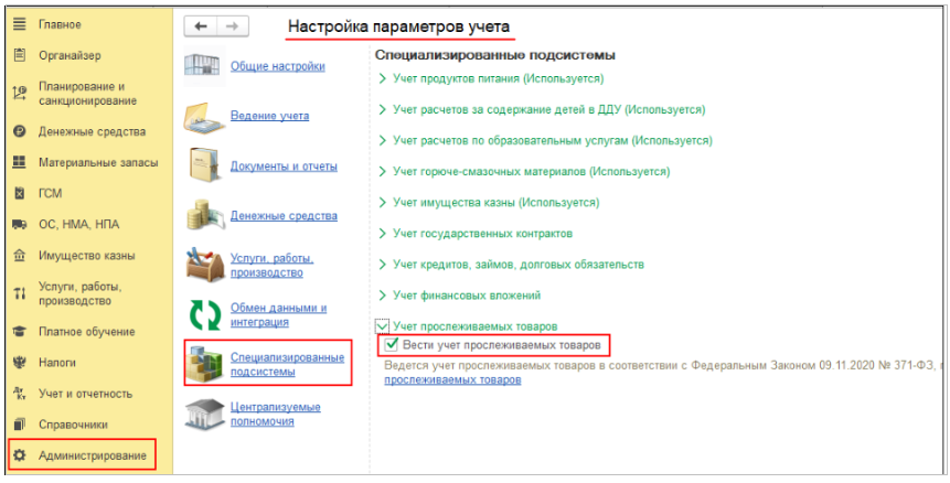 Для настройки учета прослеживаемых товаров необходимо в разделе «Администрирование – Настройка параметров учета – Специализированные подсистемы – Учет прослеживаемых товаров» включить флаг «Вести учет прослеживаемых товаров».