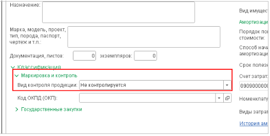 Вид контроля продукции (в нашем случае сам объект ОС непрослеживаемый, а прослеживаемой является только его составная часть, в связи с чем данный реквизит будет заполнен значением «Не контролируется»;