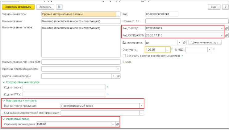 Для того, чтобы отразить прослеживаемую комплектующую в составе непрослеживаемого товара, необходимо в справочнике «Номенклатура» (меню «Материальные запасы») заполнить дополнительные реквизиты: