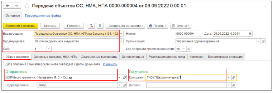 На закладке «Основные средства, НМА, НПА» из справочника выбирается инвентарный объект, который подлежит передаче. При правильном ведении карточки ОС, все реквизиты табличной части будут заполнены автоматически.