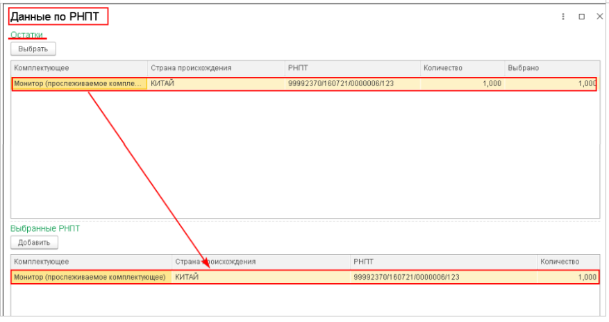 В документе «Передача объектов ОС, НМА, НПА» значение «РНПТ» не выбирается из справочника «Номера грузовых таможенных деклараций», а подбирается по остаткам. При подборе остатков по РНПТ вручную в графе РНПТ следует открыть форму «Данные по РНПТ». В верхней таблице «Остатки» отображаются остатки по РНПТ самого прослеживаемого основного средства и остатки по РНПТ комплектующих основного средства.