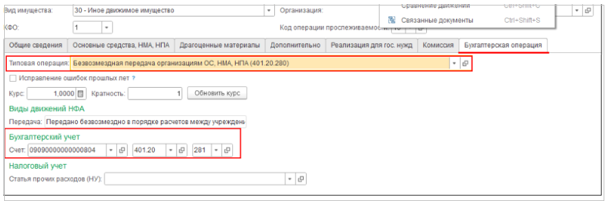 На закладке «Бухгалтерская операция» из справочника выбирается вид типовой операции, в соответствии с которым должны формироваться бухгалтерские проводки. В нашем примере необходимо выбрать операцию «Безвозмездная передача организациям ОС, НМА, НПА (401.20.280)».