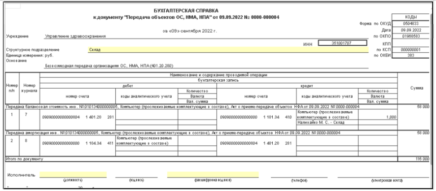 После проведения документа по кнопке «Печать» можно распечатать «Бухгалтерскую справку» (ф. 0504833) и «Акт о приеме-передаче объектов нефинансовых активов» (ф. 0504101).