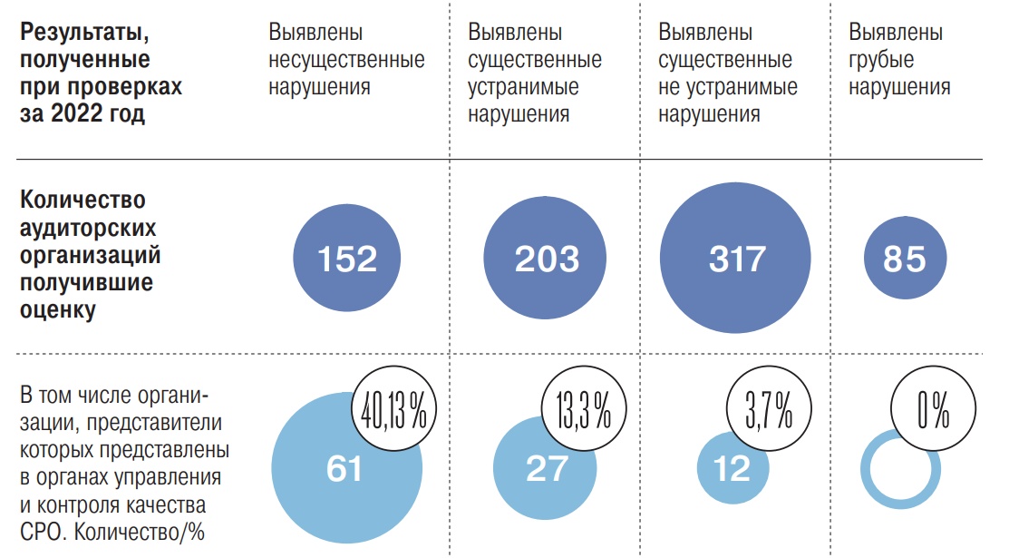 Вторая проблема — «странность» результатов контроля качества. Из 757 аудиторов, вошедших в план проверок на 2022 год, 152 (20%), по мнению контролеров качества и уполномоченных экспертов, проводят проверки без существенных нарушений. При этом 40% этих «отличников» являются представителями органов управления или контролерами качества СРО, а по остальным 80% («нарушителям») доля представителей органов управления или контролеров качества СРО — 6%, причем две трети от них получили средние, а не плохие или очень плохие (с представителями в СРО таких и не было) оценки. Выводы напрашиваются сами.