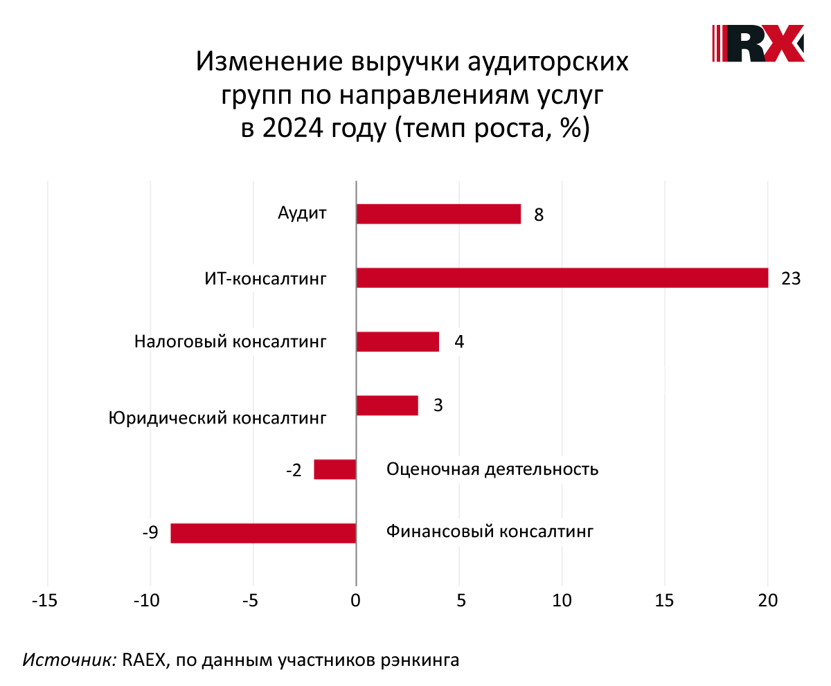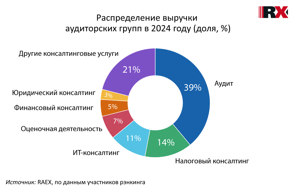 Наибольший объём выручки (после объёма доходов от аудита) крупнейшие АКГ заработали на услугах налогового консалтинга. Суммарная выручка в 2024 году в этом секторе составила 10,482 млрд рублей, увеличившись за год, по сопоставимым данным, на 4 %. На предоставлении юридических услуг в 2024 году крупнейшие аудиторские группы заработали 2,008 млрд рублей (темп роста +3 % за год). Объём выручки от услуг финансового управления — 3,434 млрд рублей (снижение за год на 9 %).