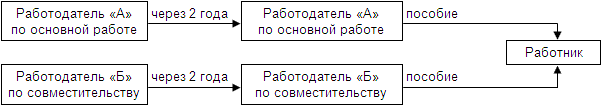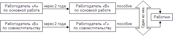3. Если работник на момент наступления страхового случая занят у нескольких страхователей, а в двух предшествующих календарных годах был занят как у этих, так и у других страхователей (другого страхователя), пособие назначается и выплачивается ему либо как в случае 1, либо как в случае 2 по выбору работника.