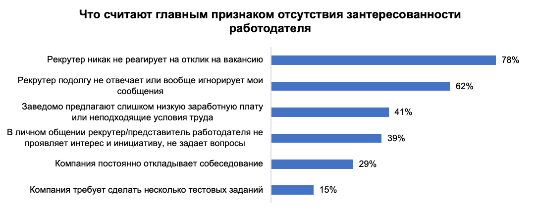Не менее важным для соискателей остаётся и обратная сторона процесса найма — признаки, по которым они понимают, что интерес со стороны компании отсутствует. В качестве таковых кандидаты чаще всего отмечают полное отсутствие реакции на отклик (78%) и слишком долгие задержки в ответе (62%). Для 41% сигналом становится заведомо низкая предлагаемая зарплата, а для 39% — отсутствие вопросов и инициативы при личном общении. Ещё 29% воспринимают как тревожный знак постоянные переносы собеседований, а 15% — чрезмерные тестовые задания.