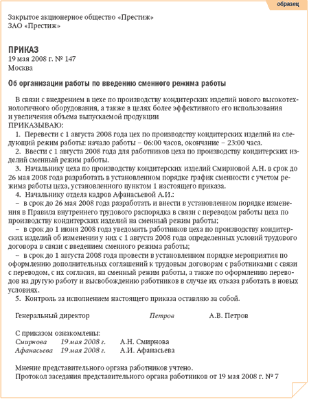 Вначале следует издать приказ*, определяющий сроки и процедуру введения сменного режима работы. Затем отразить в Правилах внутреннего трудового распорядка информацию, в отношении каких категорий работников устанавливается такой режим. Указать число смен в сутки, продолжительность ежедневной работы (смены), время начала и окончания работы в каждой смене, время перерывов в работе, чередование рабочих и нерабочих дней (ч. первая ст. 100 ТК РФ), а в случае введения суммированного учета рабочего времени установить в этом документе порядок введения такого учета (ч. третья ст. 104 ТК РФ). После этого следует разработать и утвердить в установленном порядке графики сменности.