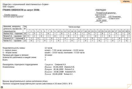 После того, как вы составите график сменности – его проект необходимо направить в представительный орган работников для учета мнения (ч. третья ст. 103 ТК РФ). После проведения всех необходимых процедур документ утверждается руководителем организации в форме грифа утверждения или путем издания распорядительного документа (например, приказа). После утверждения график сменности должен быть доведен до сведения работников, причем не позднее чем за месяц до введения его в действие (ч. четвертая ст. 103 ТК РФ). Поэтому обращайте особое внимание на дату утверждения и даты ознакомления сотрудников.