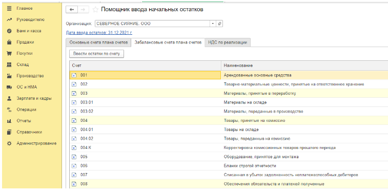 Ввод остатков по забалансовым счетам