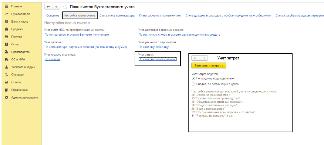 Если в организации планируется ведение учета по каждому подразделению, необходимо выставить нужные настройки в программе. Для этого необходимо перейти в раздел «Главное» – «План счетов» – ссылка «Настройка плана счетов» в группе «Учет затрат» выбрать как будут вестись затраты – по каждому подразделению или нет.