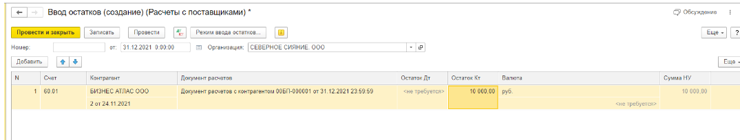 Ввод начальных остатков по поставщикам