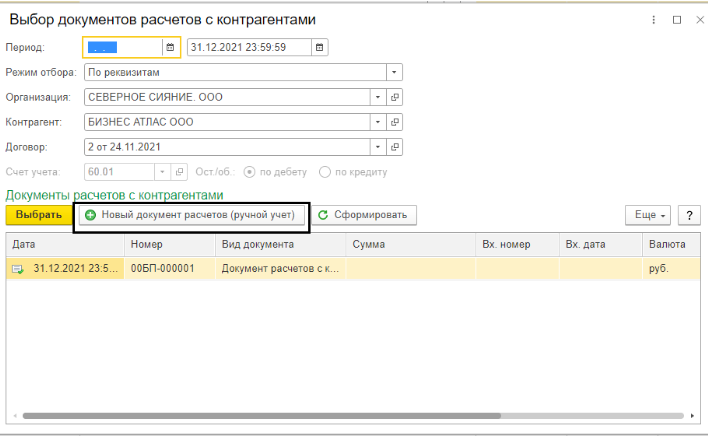 Документ расчетов с контрагентом, его можно создать с помощью клавиши «Новый документ расчётов (ручной ввод)»;