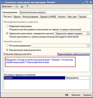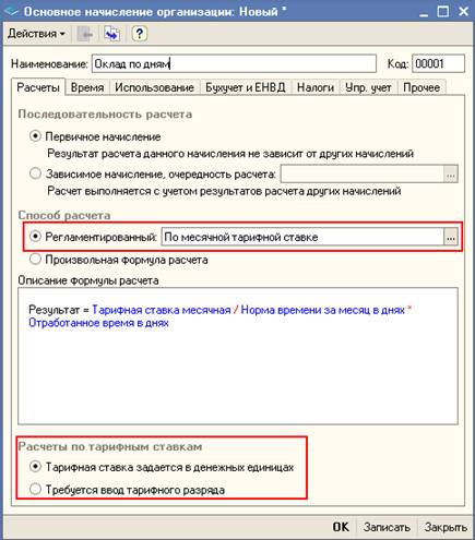 Открыв План видов расчета «Основные начисления организаций», открываем предопределенный элемент «Оклад по дням» или «Оклад по часам». В первом случае используется формула: