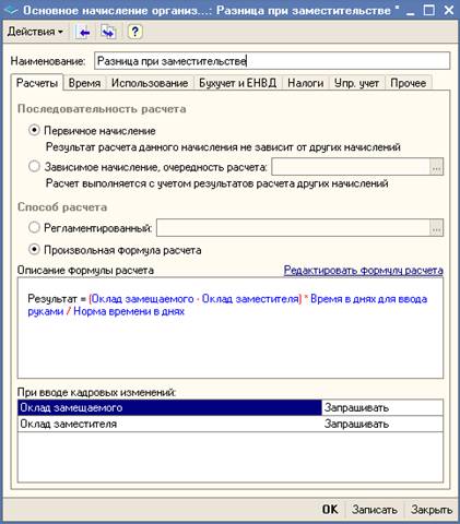 Выплата за временное заместительство отражается в Плане видов расчета «Основные начисления организаций». Мы предлагаем ввести новый вид расчета с добавлением следующей формулы: